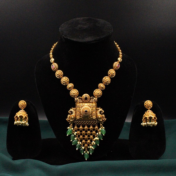 Gold Plated Green Temple Long Necklace Set
