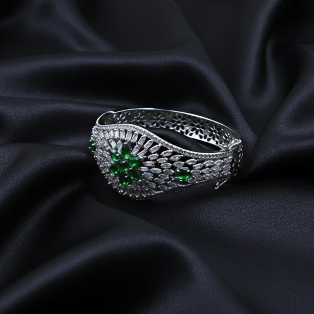 AD Studded Green Stone Floral Design Openable Kada