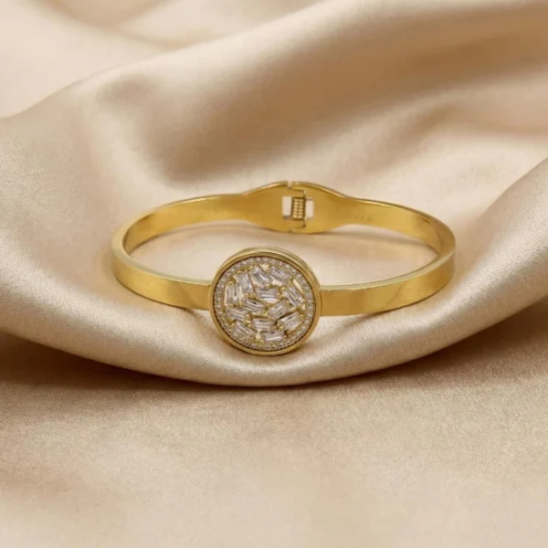 Add instant elegance to your style with this gold finish stainless steel ad & stone studded kada. Designed with a centred statement detail and easy openable fit, it’s perfect for parties, festive occasions, and special moments. Set in gold finish stainless steel with sparkling ad stones and rhinestones, this openable kada blends style and convenience for everyday elegance.