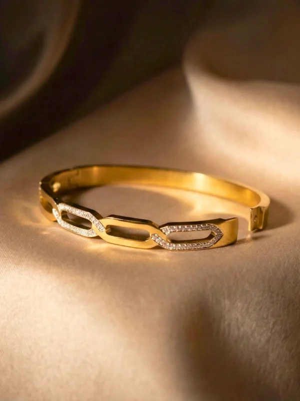 Add instant glamour to your style with this gold finish stainless steel ad studded link kada. Designed with an easy openable fit, it’s perfect for parties, festive occasions, and special moments. Crafted in gold finish stainless steel with ad-studded detailing, this openable kada offers effortless wear with a secure and comfortable fit.