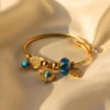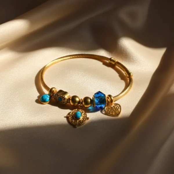 Add charm and positivity to your look with this gold finish stainless steel blue beads and evil eye charms bracelet. Perfect for daily wear and casual outings, it adds style with meaning to every outfit. Crafted in gold finish stainless steel, this piece is beautifully accented with blue beads and charming details for a graceful, elegant look.