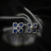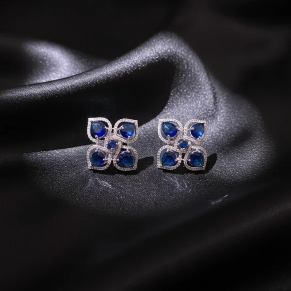 Add elegant sparkle to your everyday style with these rhodium finish blue stone AD flower shaped stud earrings, crafted for lightweight comfort and timeless beauty. Set in rhodium finish brass metal with blue synthetic stone and American diamond studded. Perfect for parties and special occasion. Secure push-back closure for easy and comfortable fit – ensures stability and convenience for stud, hoop, dangler earrings.