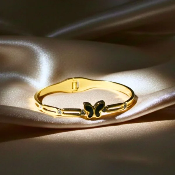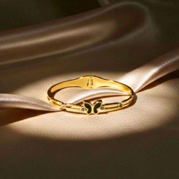 Add a graceful charm to your look with this gold finish stainless steel butterfly design kada. Designed with an easy openable fit, it’s perfect for everyday wear and special occasions. Crafted in gold finish stainless steel with elegant black meenakari and stone detailing, this openable kada offers effortless wear with a secure, comfortable fit.