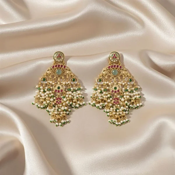 Add royal charm to your look with these Kundan Kashmiri dangling earrings, highlighted by shimmering synthetic stones and delicate pearl accents. Finished in a rich gold finish shine, they are perfect for weddings, festive occasions, and cultural celebrations. Set in gold plated green and red synthetic stone with beads and pearls hanging. Ideal for special ocassion and wedding functions. Secure push-back closure for easy and comfortable fit – ensures stability and convenience for dangler earrings.