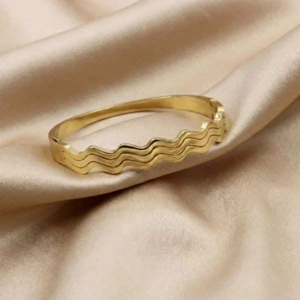 Add a modern statement to your look with this gold finish geometric wave openable kada. Designed for comfort and easy wear, it’s perfect for everyday styling and special occasions. Crafted in gold finish stainless steel and adorned with shimmering ad stones, this elegant openable kada offers effortless wear with a secure, comfortable fit.