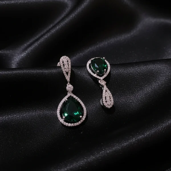 Add elegant sparkle to your festive looks with these rhodium finish emerald green stone AD studded drop earrings, crafted for graceful movement and timeless beauty. Set in rhodium finish brass metal with green synthetic stone and American diamond studded. Perfect for parties and special occasion. Secure push-back closure for easy and comfortable fit, ensures stability and convenience for stud, hoop, dangler earrings.
