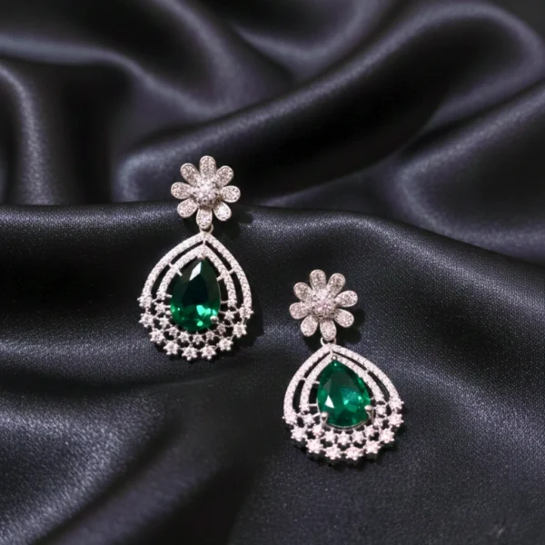 Add elegant sparkle to your festive looks with these rhodium finish green stone AD studded dangler earrings, crafted for graceful movement and timeless beauty. Set in rhodium finish brass metal with green synthetic stone and American diamond studded. Perfect for parties and special occasion. Secure push-back closure for easy and comfortable fit, ensures stability and convenience for stud, hoop, dangler earrings.