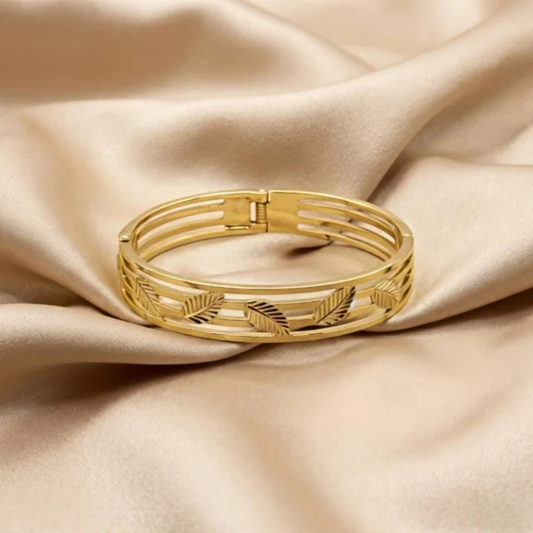 Add a graceful statement to your look with this Gold Finish Stainless Steel Leaf Design Kada. Perfect for everyday wear and festive styling, it brings natural elegance to any outfit. Set in gold finish stainless steel with sparkling AD stones, this openable kada blends style and convenience for everyday elegance.