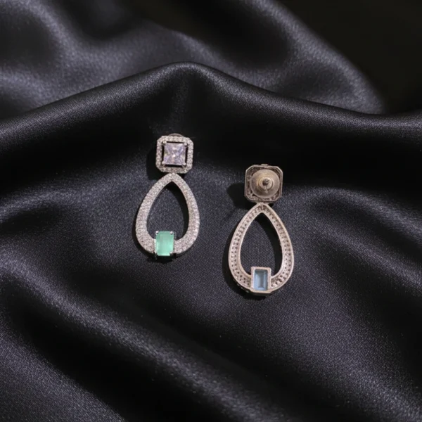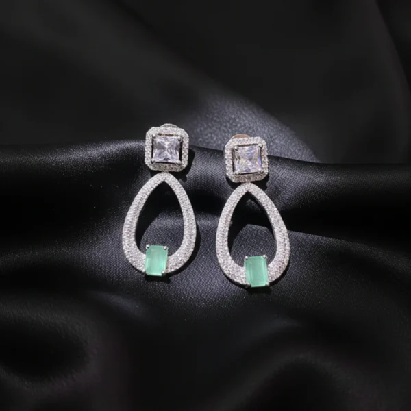 Add graceful sparkle to your festive looks with these rhodium finish mint green stone AD studded dangling earrings, crafted for elegant movement and timeless beauty. Set in rhodium finish brass metal with mint green synthetic stone and American diamond studded. Perfect for parties and special occasion. Secure push-back closure for easy and comfortable fit – ensures stability and convenience for stud, hoop, dangler earrings.