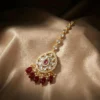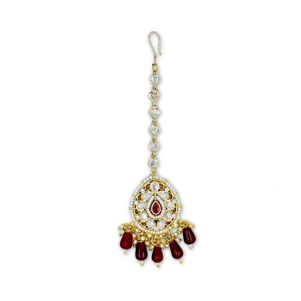 Add a touch of regal elegance to your look with this gold finish moissanite kundan maang tikka, beautifully adorned with red beads and pearls, perfect for bridal and festive styling. Crafted in gold-finish brass, this piece features a hair hook that slides easily into the hair, stays secure without pins, and remains comfortable for long wear.