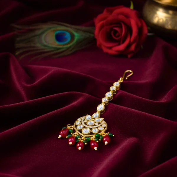 Adorned with elegant green and red beads, reflecting timeless bridal charm. Crafted with a rich gold finish and intricate kundan detailing, this maangtikka adds a regal touch to wedding and festive ensembles. Crafted in gold-finish brass, this piece features a hair hook that slides easily into the hair, stays secure without pins, and remains comfortable for long wear.