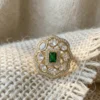 The gold finish moissanite polki adjustable ring features a striking green emerald stone accented with shimmering cubic zircon and moissanite polki. Finished in a rich gold tone with an adjustable band, this ring offers a perfect blend of elegance, comfort, and traditional charm, ideal for festive and wedding wear. Crafted in gold finish brass metal, embellished with moissanite polki, a green synthetic stone, and cubic zircon studding, these pressing adjustable rings reflect refined craftsmanship and timeless elegance.