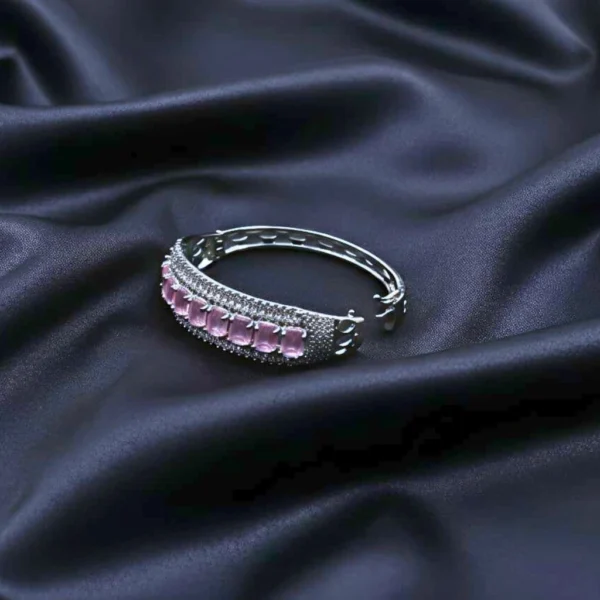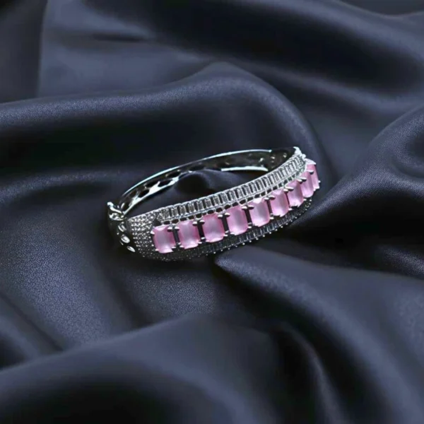 Add a graceful touch to your style with this rhodium plated pink stone kada featuring sparkling American diamonds. Designed with an easy openable fit, it is perfect for weddings, parties, and festive celebrations. Set in rhodium-plated brass with a pink synthetic stone and AD studding, this piece blends style with convenience. Its openable design and sturdy clip-lock mechanism make it easy to wear while ensuring a secure fit.
