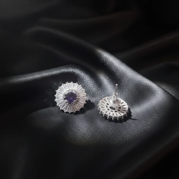 Add elegant sparkle to your everyday style with these rhodium finish purple stone centered flower design AD stud earrings, crafted for lightweight comfort and timeless beauty. Set in rhodium finish brass metal with purple synthetic stone and American diamond studded. Perfect for parties and special occasion. Secure push-back closure for easy and comfortable fit, ensures stability and convenience for stud, hoop, dangler earrings.