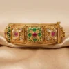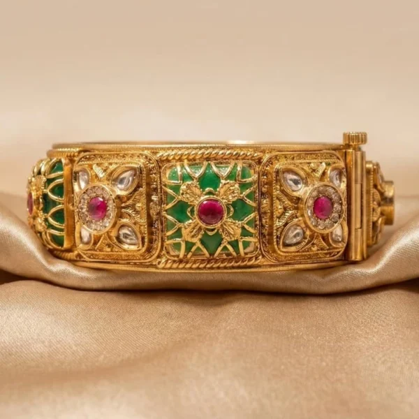 Add regal charm to your festive look with these gold finish green & red stone rajwadi heritage kada bangles, featuring a secure screw-open design and elegant traditional detailing. Set in gold finish brass with a sturdy screw-lock closure, this piece offers both style and security, making it ideal for everyday elegance and durability.