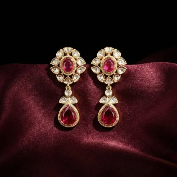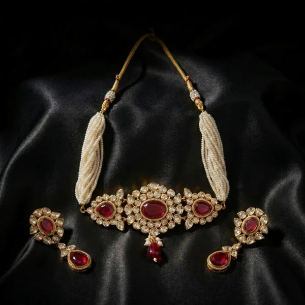 Add regal charm to your ethnic look with this gold finish choker necklace set featuring rich red polki stones and delicate bead detailing. Designed for weddings, festive occasions, and cultural celebrations, this statement piece pairs beautifully with sarees and lehengas for timeless elegance. Crafted using gold-finish moissanite polki, enhanced with rich red stones and refined pearl detailing.