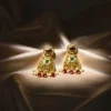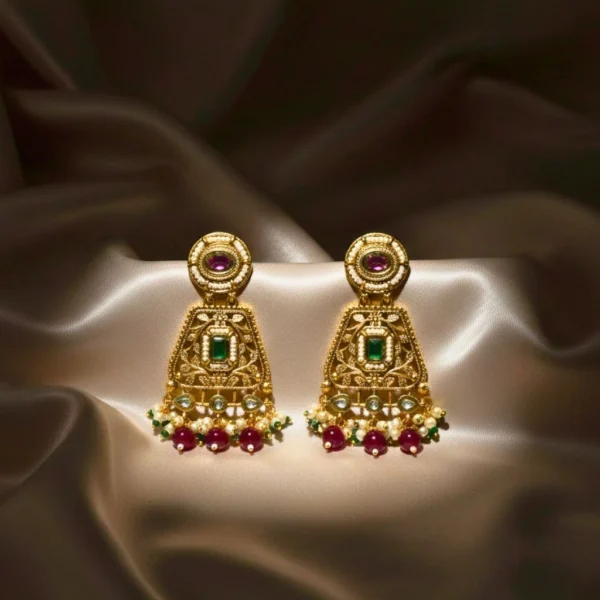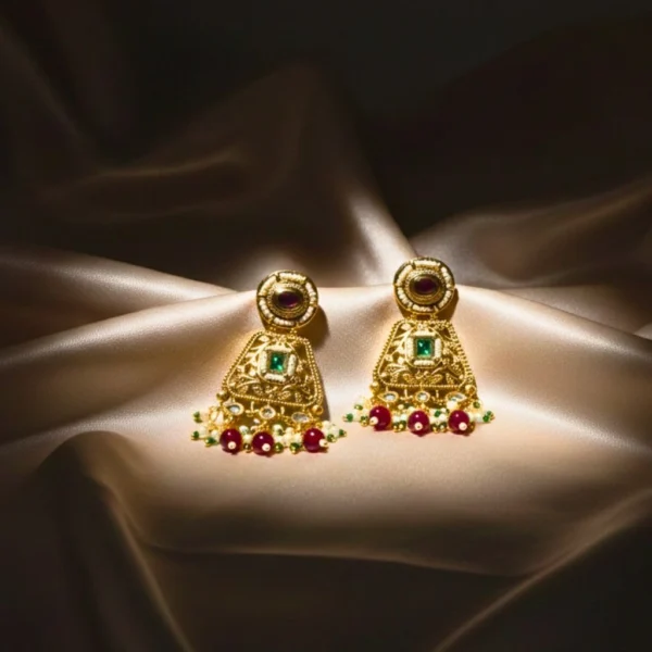Add timeless elegance to your look with our earrings, adorned with multi synthetic stones for a rich traditional finish. Perfect for weddings, festive occasions, and ethnic celebrations. Set in gold plated brass metal with moissanite kundan, red synthetic stone with red beads and pearls hanging. ideal for special occasion and wedding functions. Secure push-back closure for easy and comfortable fit, ensures stability and convenience for dangler earrings.
